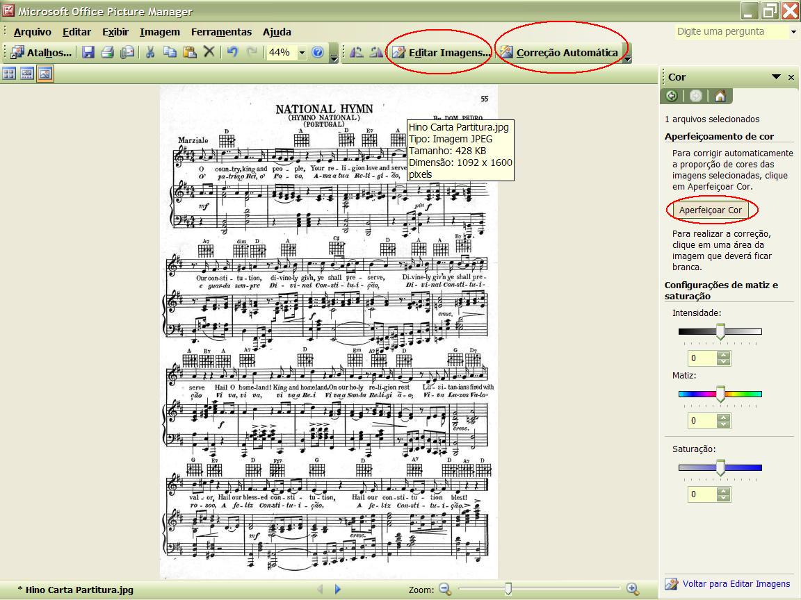 2) Click no botão "EDITAR IMAGENS", do lado direto click em "COR", em seguida em "APERFEIÇOAR COR". Passe o cursor (flechinha do mouse) na partitura, você notará um círculo, então click em uma área que deveria ser branca.